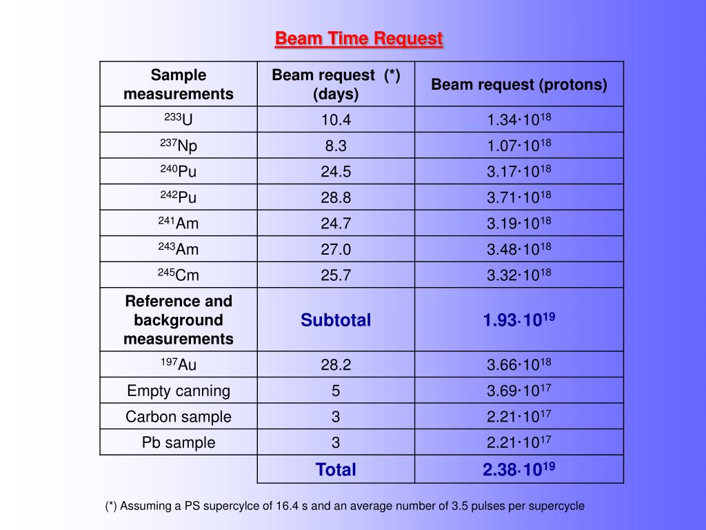 Beam Time Request (*) Assuming a PS supercylce of 16.4 s and an average number of 3.5 pulses per supercycle