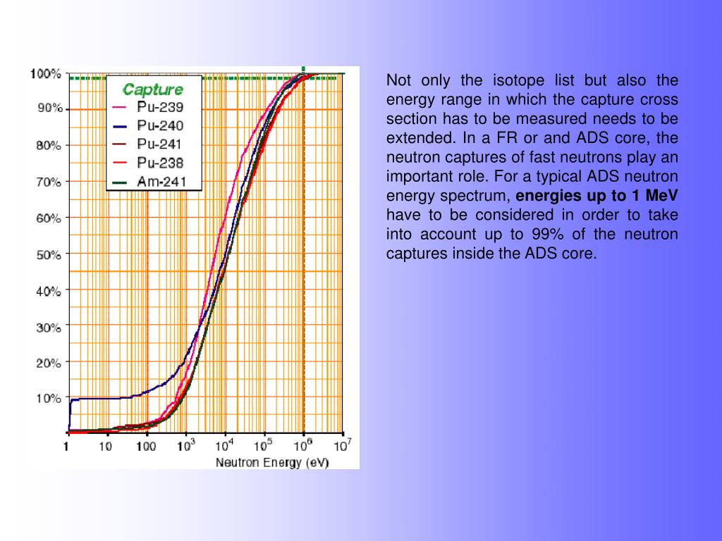 Not only the isotope list but also the energy range in which the capture cross section has to be measured needs to be extended. In a FR or and ADS core, the neutron captures of fast neutrons play an important role. For a typical ADS neutron energy spectrum, energies up to 1 MeV have to be considered in order to take into account up to 99% of the neutron captures inside the ADS core.