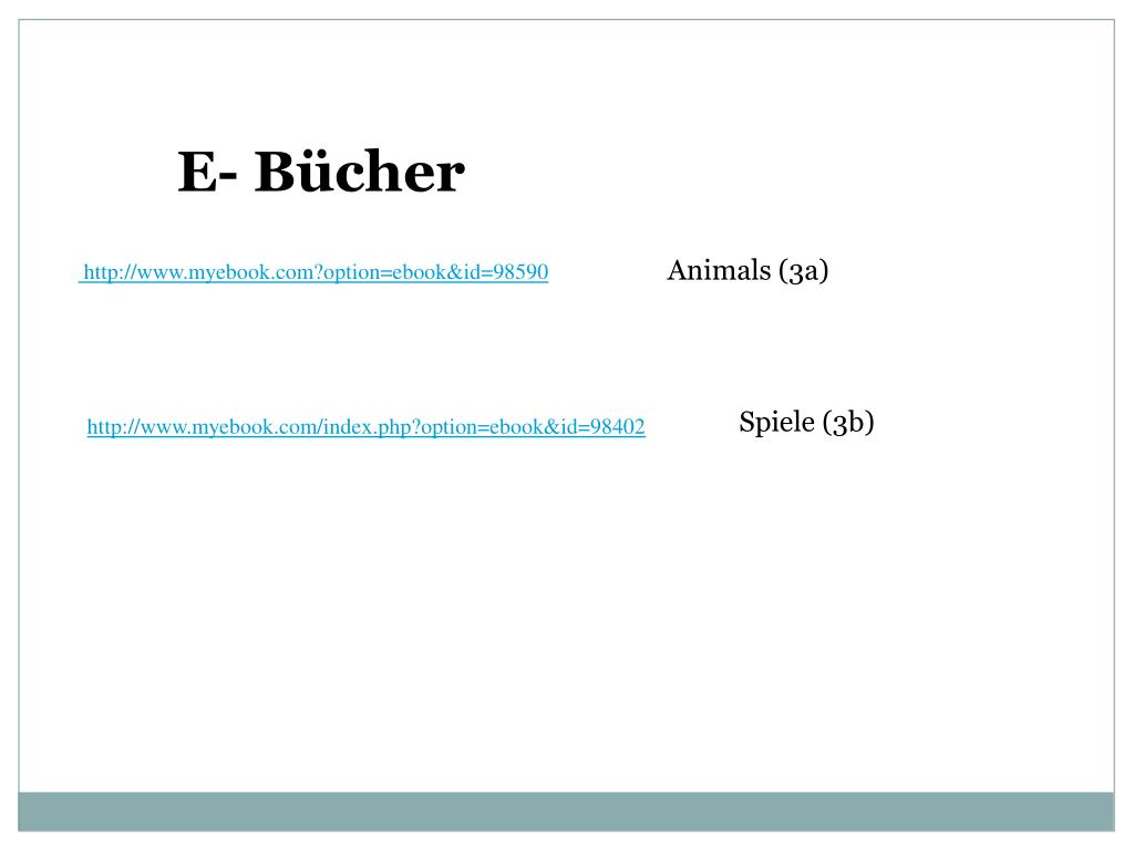 E- Bücher http://www.myebook.com?option=ebook&id=98590 Animals (3a) Spiele (3b) http://www.myebook.com/index.php?option=ebook&id=98402