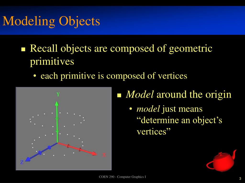 Modeling Objects • Recall objects are composed of geometric primitives • each primitive is composed of vertices • Model around the origin • model just means “determine an object’s vertices” COEN 290 - Computer Graphics I