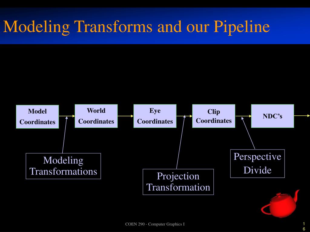 Model Coordinates Model Coordinates Model Coordinates Current Transformation Pipeline World Coordinates Eye Coordinates ClipCoordinates NDC’s Perspective Divide ProjectionTransformation ModelingTransformations COEN 290 - Computer Graphics I