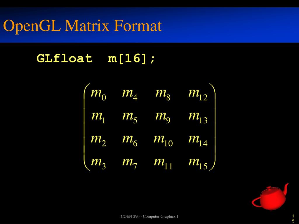 OpenGL Matrix Format GLfloat m[16]; COEN 290 - Computer Graphics I