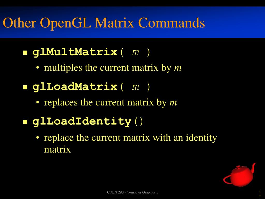Other OpenGL Matrix Commands • glMultMatrix( m ) • multiples the current matrix by m • glLoadMatrix( m ) • replaces the current matrix by m • glLoadIdentity() • replace the current matrix with an identity matrix COEN 290 - Computer Graphics I