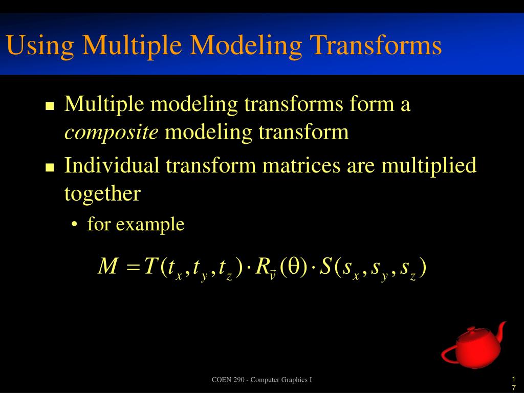 Using Multiple Modeling Transforms • Multiple modeling transforms form a composite modeling transform • Individual transform matrices are multiplied together • for example COEN 290 - Computer Graphics I