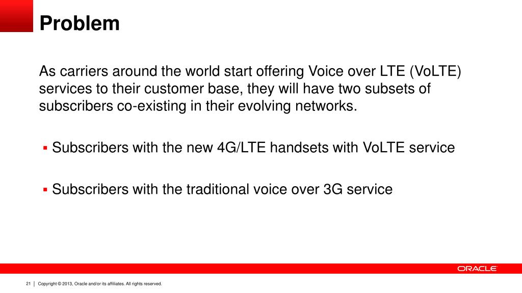 Problem As carriers around the world start offering Voice over LTE (VoLTE) services to their customer base, they will have two subsets of subscribers co-existing in their evolving networks. • Subscribers with the new 4G/LTE handsets with VoLTE service • Subscribers with the traditional voice over 3G service