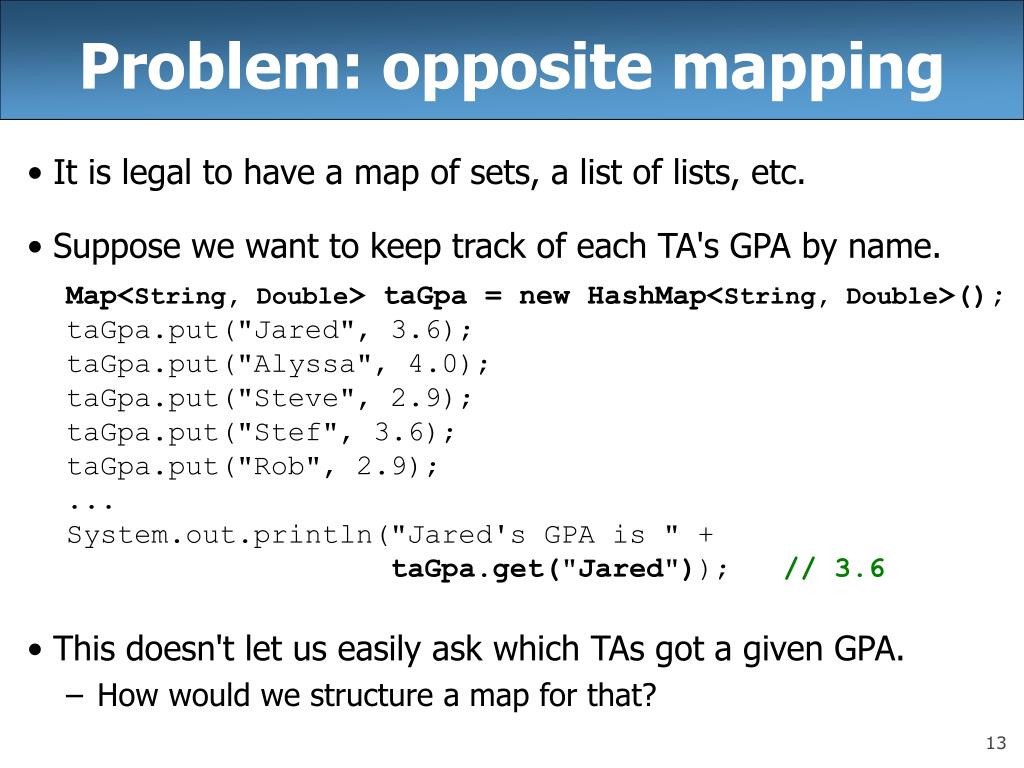 Reversing a map • We can reverse the mapping to be from GPAs to names. Map<Double, String> taGpa = new HashMap<Double, String>(); taGpa.put(3.6, "Jared"); taGpa.put(4.0, "Alyssa"); taGpa.put(2.9, "Steve"); taGpa.put(3.6, "Stef"); taGpa.put(2.9, "Rob"); ... System.out.println("Who got a 3.6? " + taGpa.get(3.6)); // ??? • What's wrong with this solution? • More than one TA can have the same GPA. • The map will store only the last mapping we add.