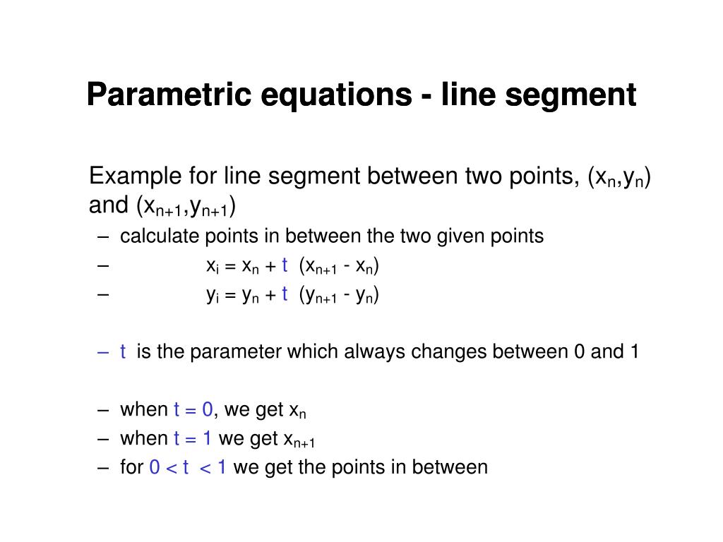 Parametric equations - line segment Parametric equations - line segment Example for line segment between two points, (xn,yn) and (xn+1,yn+1) • calculate points in between the two given points • xi = xn + t (xn+1 - xn) • yi = yn + t (yn+1 - yn) • t is the parameter which always changes between 0 and 1 • when t = 0, we get xn • when t = 1 we get xn+1 • for 0 < t < 1 we get the points in between
