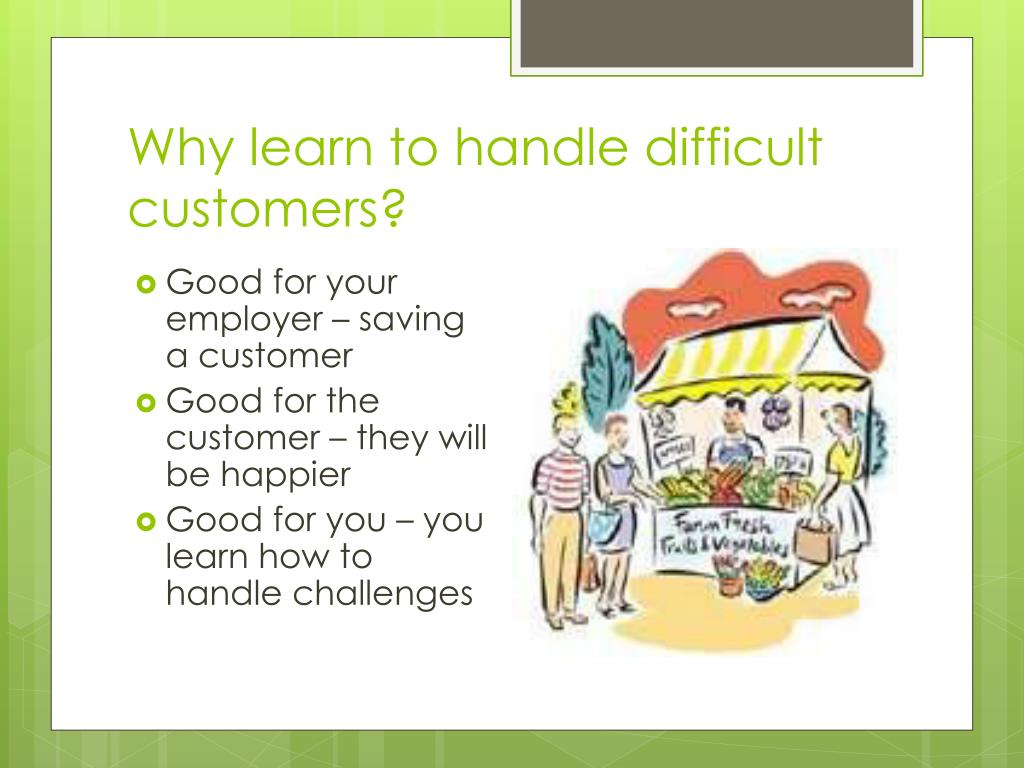 Why learn to handle difficult customers? • Good for your employer – saving a customer • Good for the customer – they will be happier • Good for you – you learn how to handle challenges