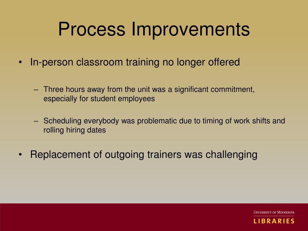 Process Improvements • In-person classroom training no longer offered • Three hours away from the unit was a significant commitment, especially for student employees • Scheduling everybody was problematic due to timing of work shifts and rolling hiring dates • Replacement of outgoing trainers was challenging