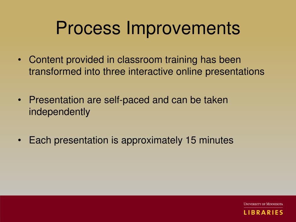 Process Improvements • Content provided in classroom training has been transformed into three interactive online presentations • Presentation are self-paced and can be taken independently • Each presentation is approximately 15 minutes