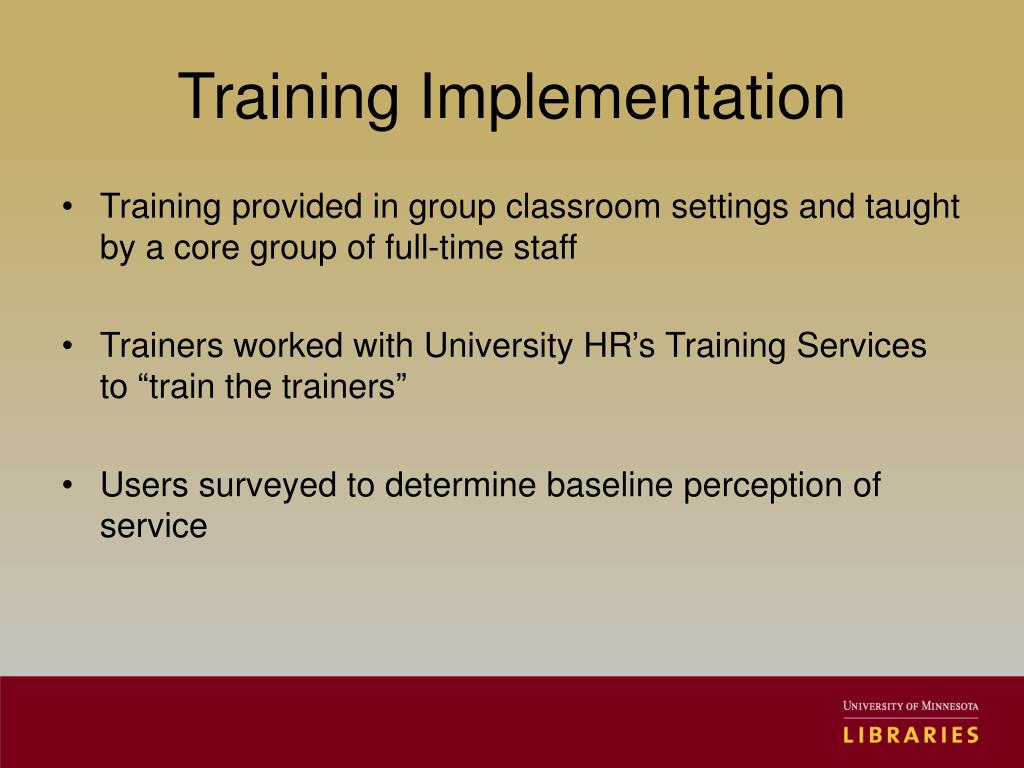 Training Implementation • Training provided in group classroom settings and taught by a core group of full-time staff • Trainers worked with University HR’s Training Services to “train the trainers” • Users surveyed to determine baseline perception of service