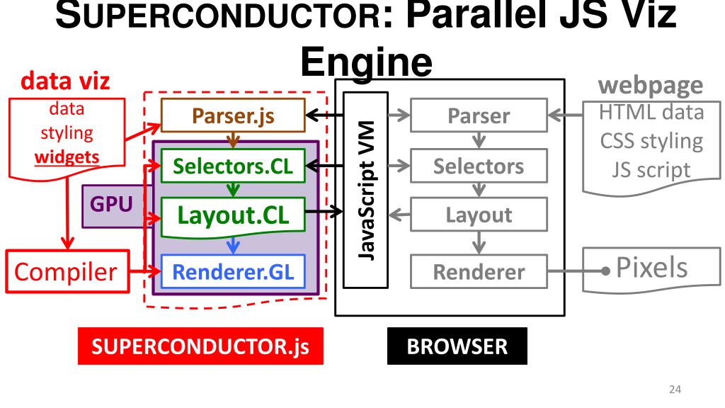 Superconductor: Parallel JS Viz Engine webpage data viz Parser HTML data CSS styling JS script data styling widgets Parser.js Selectors JavaScript VM GPU Layout Selectors.CL Pixels Renderer Layout.CL SUPERCONDUCTOR.js BROWSER Compiler Renderer.GL