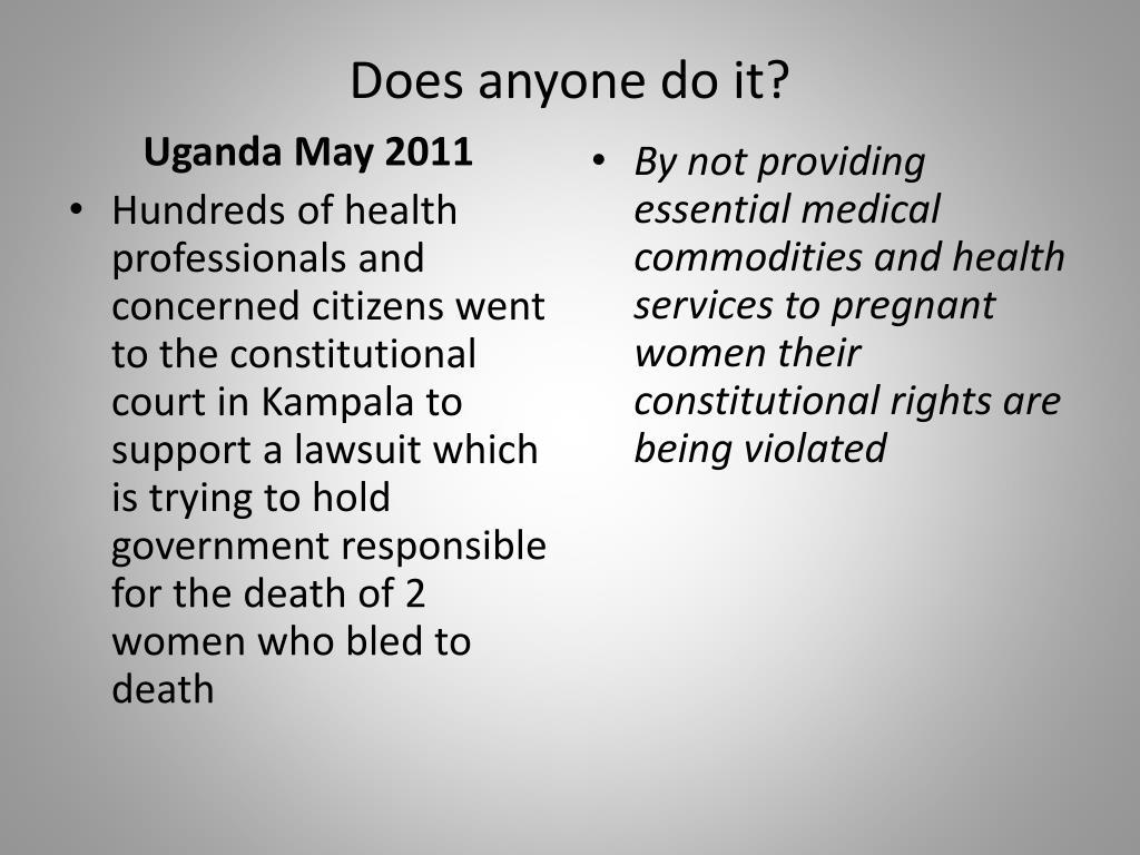 Does anyone do it? Uganda May 2011 • Hundreds of health professionals and concerned citizens went to the constitutional court in Kampala to support a lawsuit which is trying to hold government responsible for the death of 2 women who bled to death • By not providing essential medical commodities and health services to pregnant women their constitutional rights are being violated