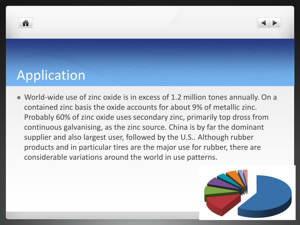 Application • World-wide use of zinc oxide is in excess of 1.2 million tones annually. On a contained zinc basis the oxide accounts for about 9% of metallic zinc. Probably 60% of zinc oxide uses secondary zinc, primarily top dross from continuous galvanising, as the zinc source. China is by far the dominant supplier and also largest user, followed by the U.S.. Although rubber products and in particular tires are the major use for rubber, there are considerable variations around the world in use patterns.