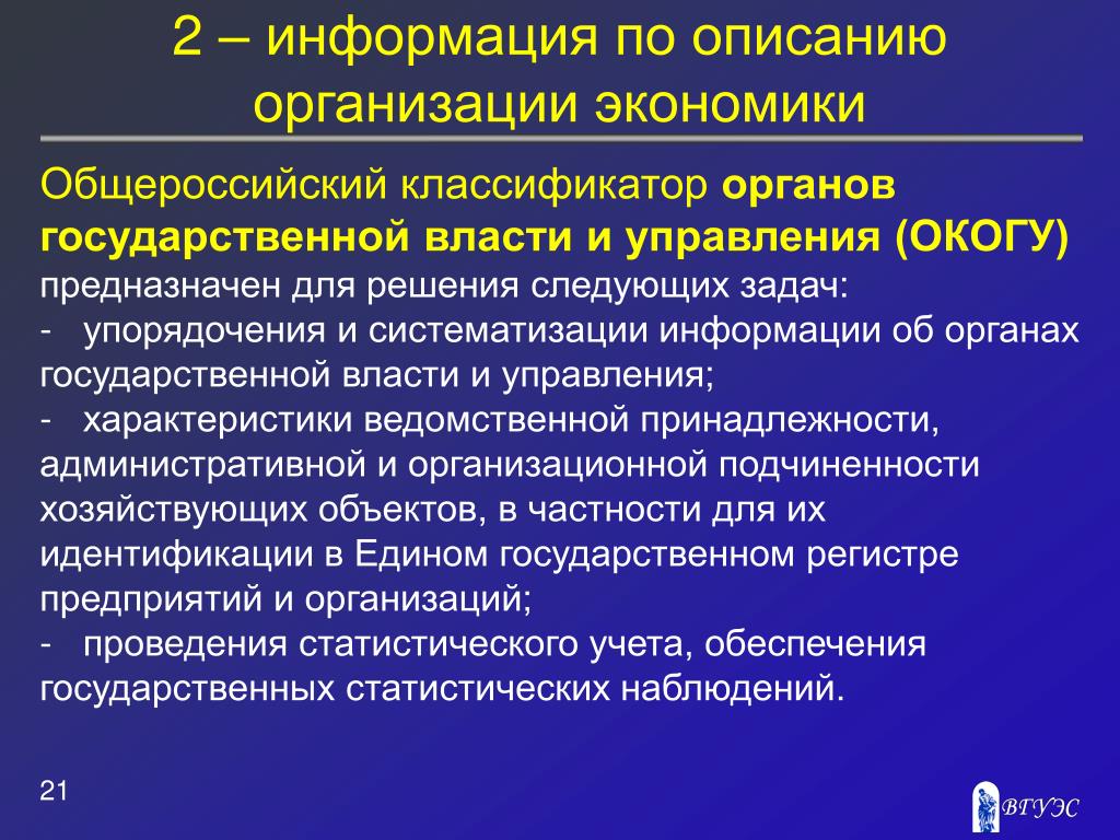 2– информация по описанию организации экономики Общероссийский классификатор органов государственной власти и управления (ОКОГУ)предназначен для решения следующих задач: - упорядочения и систематизации информации об органах государственной власти и управления; - характеристики ведомственной принадлежности, административной и организационной подчиненности хозяйствующих объектов, в частности для их идентификации в Едином государственном регистре предприятий и организаций; - проведения статистического учета, обеспечения государственных статистических наблюдений. 21