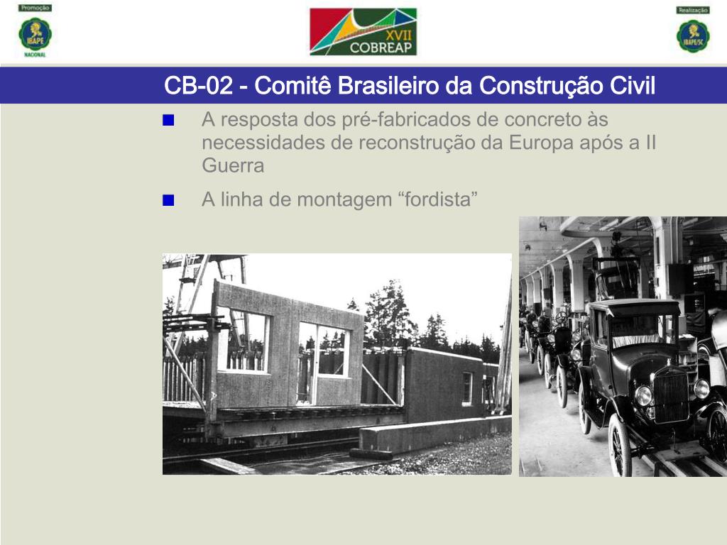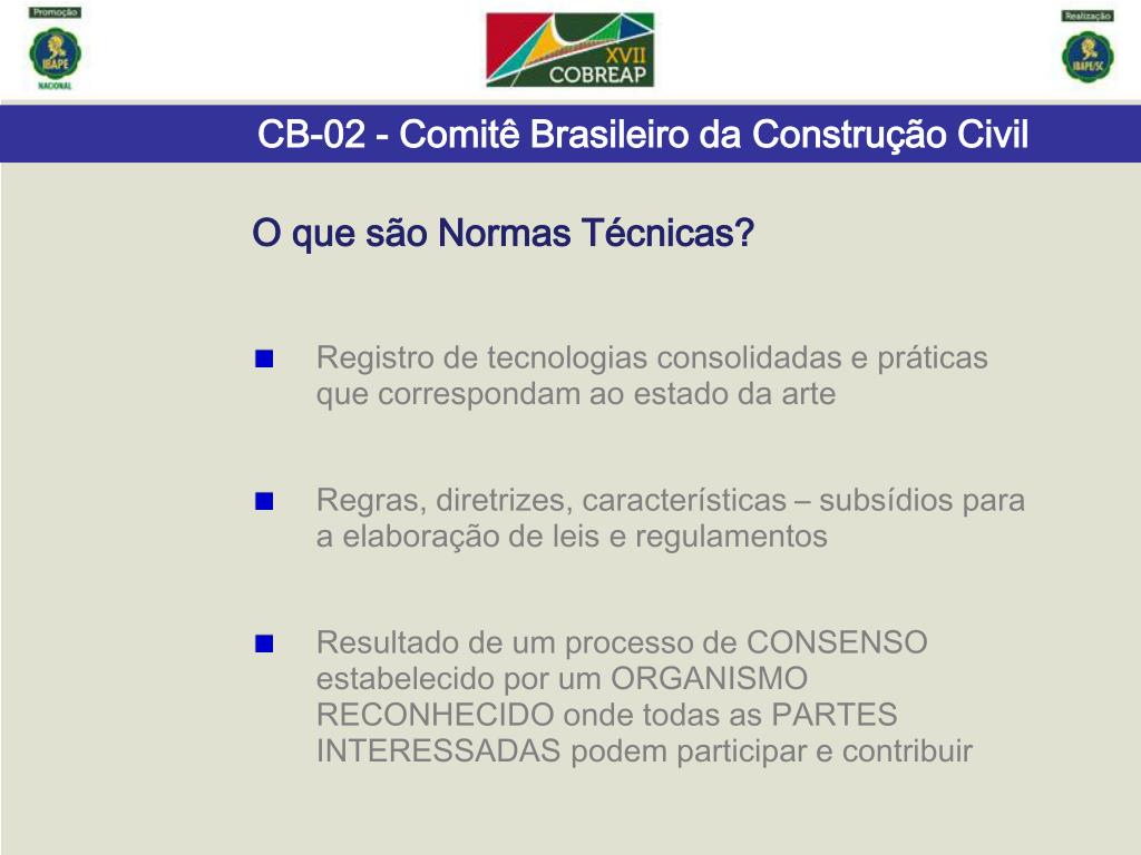 Cronologia • 04/12/2012 – Instalação da CE-02:124.17 de Reformas em Edificações • 10/04/2013 – Instalação da CE 02:140.02 de Inspeção Predial - Uma lacuna a ser preenchida – avaliação técnica da manutenção e conservação dos edifícios, considerando suas condições de segurança, desempenho e riscos aos usuários e ao patrimônio