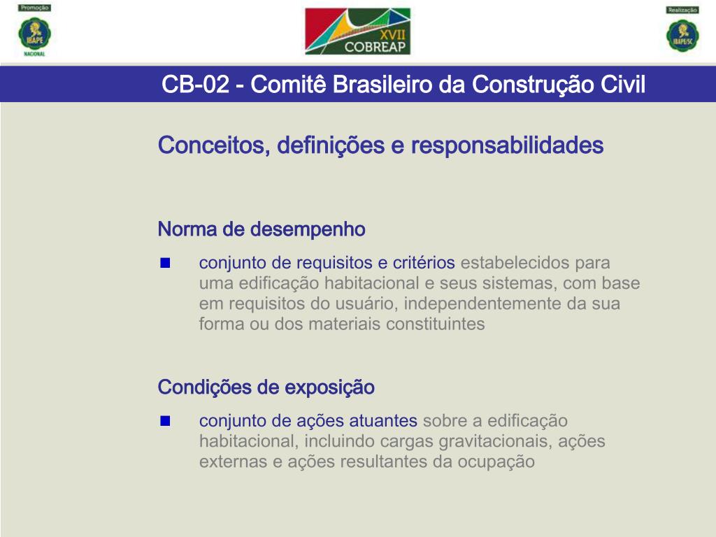 Conceitos, definições e responsabilidades • Norma de desempenho • conjunto de requisitos e critérios estabelecidos para uma edificação habitacional e seus sistemas, com base em requisitos do usuário, independentemente da sua forma ou dos materiais constituintes • Condições de exposição • conjunto de ações atuantes sobre a edificação habitacional, incluindo cargas gravitacionais, ações externas e ações resultantes da ocupação