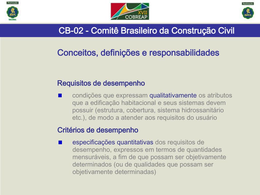 Conceitos, definições e responsabilidades • Requisitos de desempenho • condições que expressam qualitativamente os atributos que a edificação habitacional e seus sistemas devem possuir (estrutura, cobertura, sistema hidrossanitário etc.), de modo a atender aos requisitos do usuário • Critérios de desempenho • especificações quantitativas dos requisitos de desempenho, expressos em termos de quantidades mensuráveis, a fim de que possam ser objetivamente determinados (ou de qualidades que possam ser objetivamente determinadas)