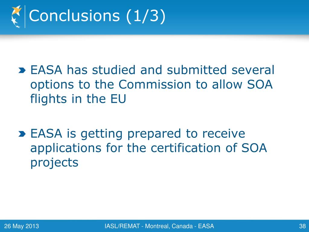Conclusions (1/3) • EASA has studied and submitted several options to the Commission to allow SOA flights in the EU • EASA is getting prepared to receive applications for the certification of SOA projects IASL/REMAT - Montreal, Canada - EASA