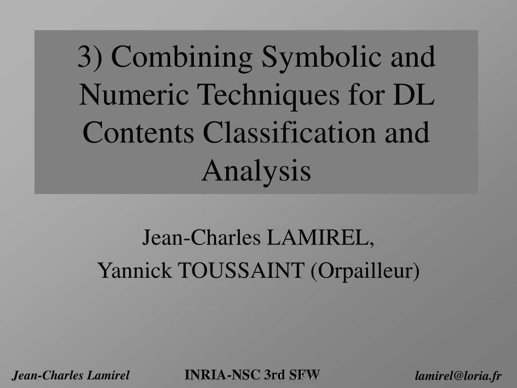 3) Combining Symbolic and Numeric Techniques for DL Contents Classification and Analysis Jean-Charles LAMIREL, Yannick TOUSSAINT (Orpailleur)