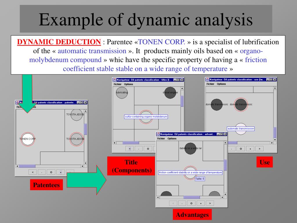Title (Components) Use Patentees Advantages Example of dynamic analysis DYNAMIC DEDUCTION : Parentee «TONEN CORP. » is a specialist of lubrification of the « automatic transmission ». It products mainly oils based on « organo- molybdenum compound » whic have the specific property of having a « friction coefficient stable stable on a wide range of temperature »