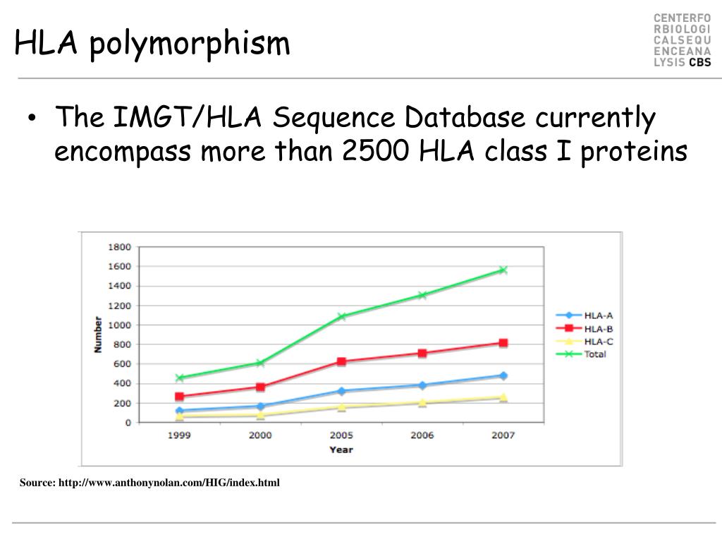 HLA polymorphism • The IMGT/HLA Sequence Database currently encompass more than 2500 HLA class I proteins Source: http://www.anthonynolan.com/HIG/index.html