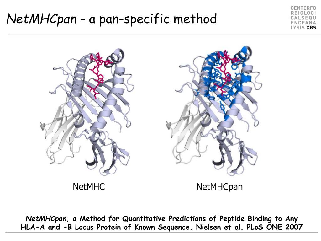 NetMHCpan NetMHCpan - a pan-specific method NetMHC NetMHCpan, a Method for Quantitative Predictions of Peptide Binding to Any HLA-A and -B Locus Protein of Known Sequence. Nielsen et al. PLoS ONE 2007
