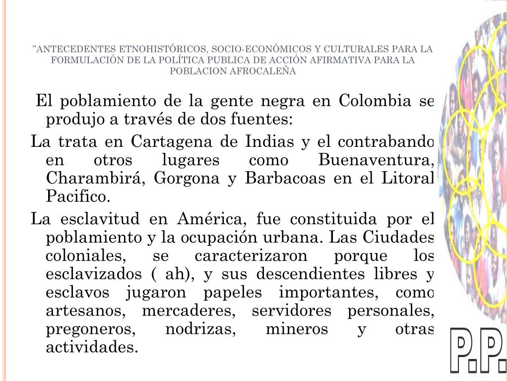 ”ANTECEDENTES ETNOHISTÓRICOS, SOCIO-ECONÓMICOS Y CULTURALES PARA LA FORMULACIÓN DE LA POLÍTICA PUBLICA DE ACCIÓN AFIRMATIVA PARA LA POBLACION AFROCALEÑA El poblamiento de la gente negra en Colombia se produjo a través de dos fuentes: La trata en Cartagena de Indias y el contrabando en otros lugares como Buenaventura, Charambirá, Gorgona y Barbacoas en el Litoral Pacifico. La esclavitud en América, fue constituida por el poblamiento y la ocupación urbana. Las Ciudades coloniales, se caracterizaron porque los esclavizados ( ah), y sus descendientes libres y esclavos jugaron papeles importantes, como artesanos, mercaderes, servidores personales, pregoneros, nodrizas, mineros y otras actividades.