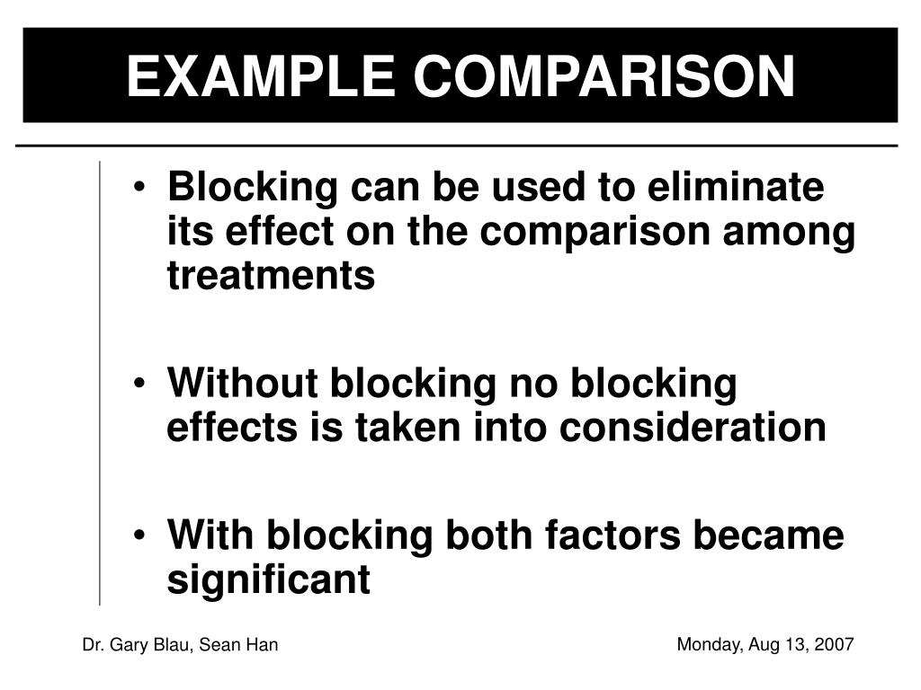 EXAMPLE COMPARISON • Blocking can be used to eliminate its effect on the comparison among treatments • Without blocking no blocking effects is taken into consideration • With blocking both factors became significant Dr. Gary Blau, Sean Han