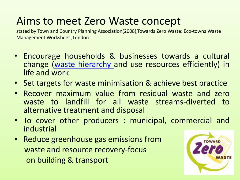 Aims to meet Zero Waste conceptstated by Town and Country Planning Association(2008),Towards Zero Waste: Eco-towns Waste Management Worksheet ,London • Encourage households & businesses towards a cultural change (waste hierarchy and use resources efficiently) in life and work • Set targets for waste minimisation & achieve best practice • Recover maximum value from residual waste and zero waste to landfill for all waste streams-diverted to alternative treatment and disposal • To cover other producers : municipal, commercial and industrial • Reduce greenhouse gas emissions from waste and resource recovery-focus on building & transport