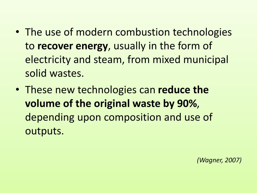 The use of modern combustion technologies to recover energy, usually in the form of electricity and steam, from mixed municipal solid wastes. • These new technologies can reduce the volume of the original waste by 90%, depending upon composition and use of outputs. (Wagner, 2007)