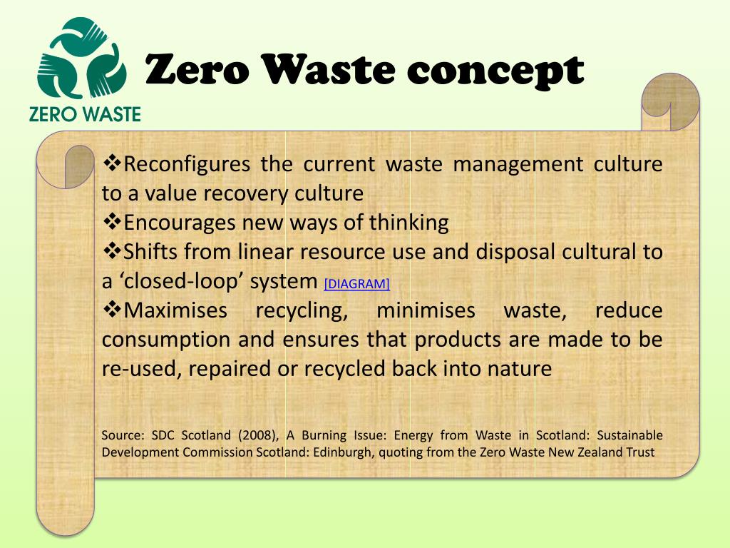 Zero Waste concept • Reconfigures the current waste management culture to a value recovery culture • Encourages new ways of thinking • Shifts from linear resource use and disposal cultural to a ‘closed-loop’ system [DIAGRAM] • Maximises recycling, minimises waste, reduce consumption and ensures that products are made to be re-used, repaired or recycled back into nature • Source: SDC Scotland (2008), A Burning Issue: Energy from Waste in Scotland: Sustainable Development Commission Scotland: Edinburgh, quoting from the Zero Waste New Zealand Trust