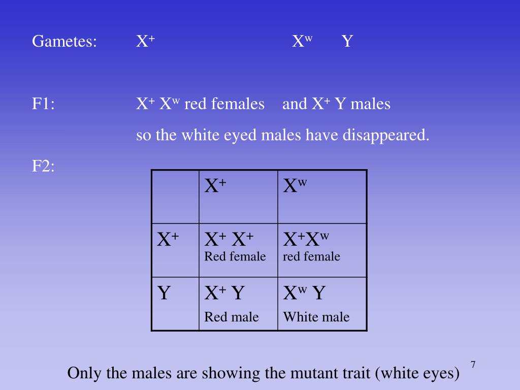 Gametes: X+ Xw Y F1: X+ Xw red females and X+ Y males so the white eyed males have disappeared. F2: Only the males are showing the mutant trait (white eyes)