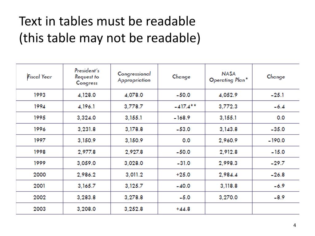 Design your graphics for the projector, not for the laptop Many graphics (images, diagrams, and tables) are too complex for projected slides, or use text that is too small. If the graphic is too complex for your audience to see or includes text too small for your audience to see, then the graphic is probably noise, not signal. One solution is to simplify the graphic (e.g., replace table with chart).