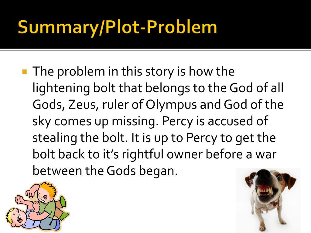 Summary/Plot-Problem • The problem in this story is how the lightening bolt that belongs to the God of all Gods, Zeus, ruler of Olympus and God of the sky comes up missing. Percy is accused of stealing the bolt. It is up to Percy to get the bolt back to it’s rightful owner before a war between the Gods began.