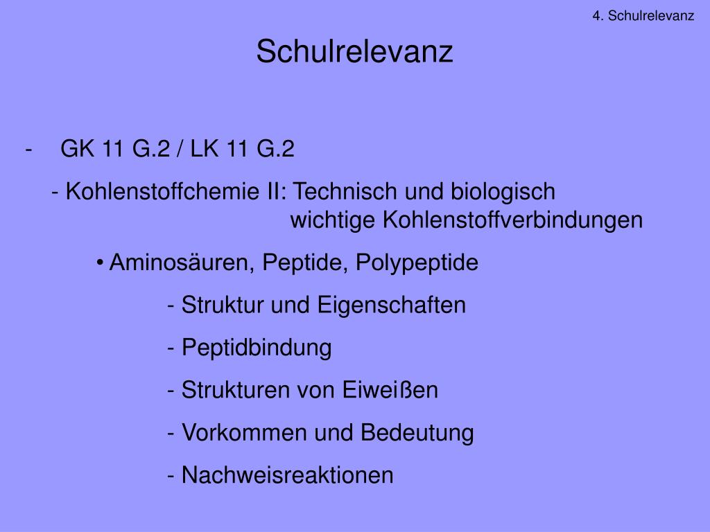 4. Schulrelevanz Schulrelevanz • GK 11 G.2 / LK 11 G.2 • - Kohlenstoffchemie II: Technisch und biologisch wichtige Kohlenstoffverbindungen • • Aminosäuren, Peptide, Polypeptide • - Struktur und Eigenschaften • - Peptidbindung • - Strukturen von Eiweißen • - Vorkommen und Bedeutung • - Nachweisreaktionen