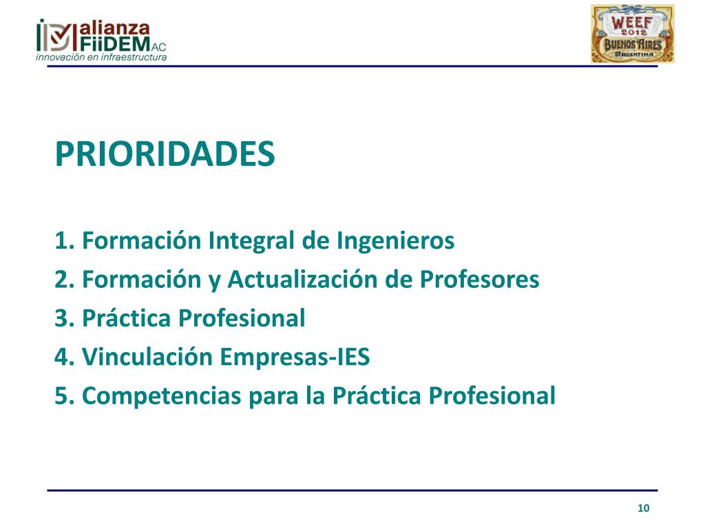 Prioridades1. Formación Integral de Ingenieros2. Formación y Actualización de Profesores3. Práctica Profesional4. Vinculación Empresas-IES5. Competencias para la Práctica Profesional