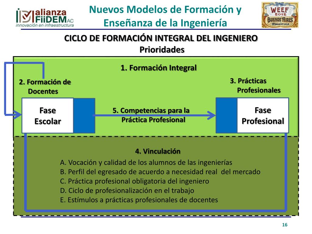 Nuevos Modelos de Formación y Enseñanza de la Ingeniería CICLO DE FORMACIÓN INTEGRAL DEL INGENIERO Prioridades 1. Formación Integral 3. Prácticas Profesionales 2. Formación de Docentes Fase Profesional Fase Escolar 5. Competencias para la Práctica Profesional 4. Vinculación • A. Vocación y calidad de los alumnos de las ingenierías • B. Perfil del egresado de acuerdo a necesidad real del mercado • C. Práctica profesional obligatoria del ingeniero • D. Ciclo de profesionalización en el trabajo • E. Estímulos a prácticas profesionales de docentes