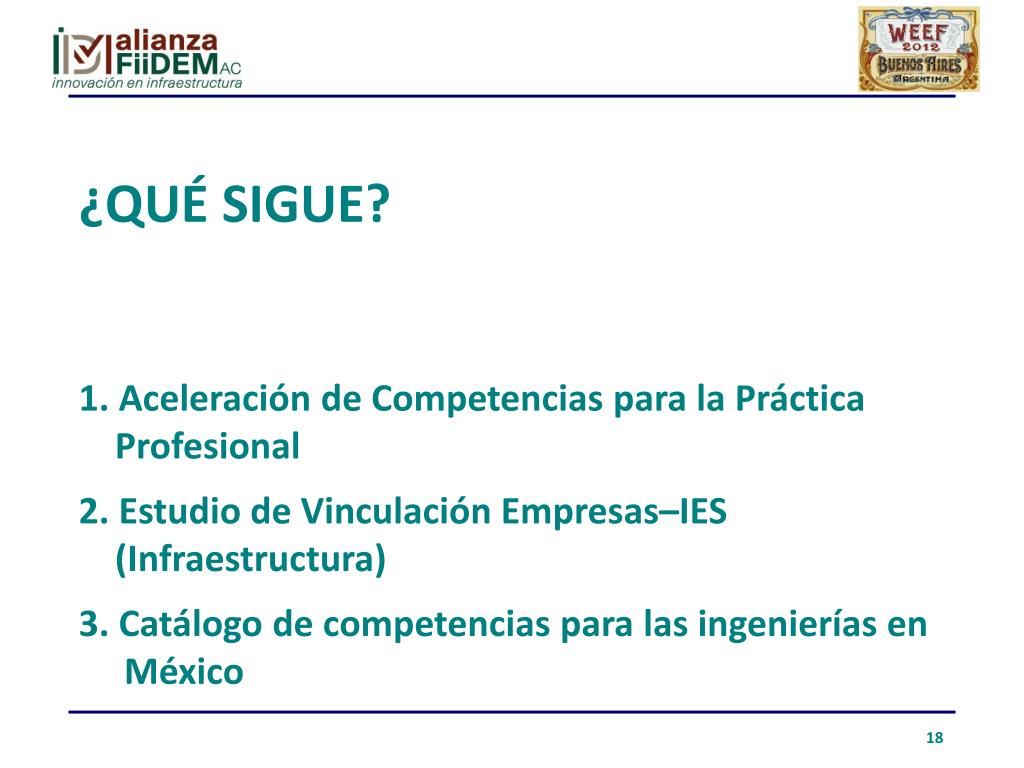 ¿qué sigue?1. Aceleración de Competencias para la Práctica Profesional2. Estudio de Vinculación Empresas–IES (Infraestructura)3. Catálogo de competencias para las ingenierías en México