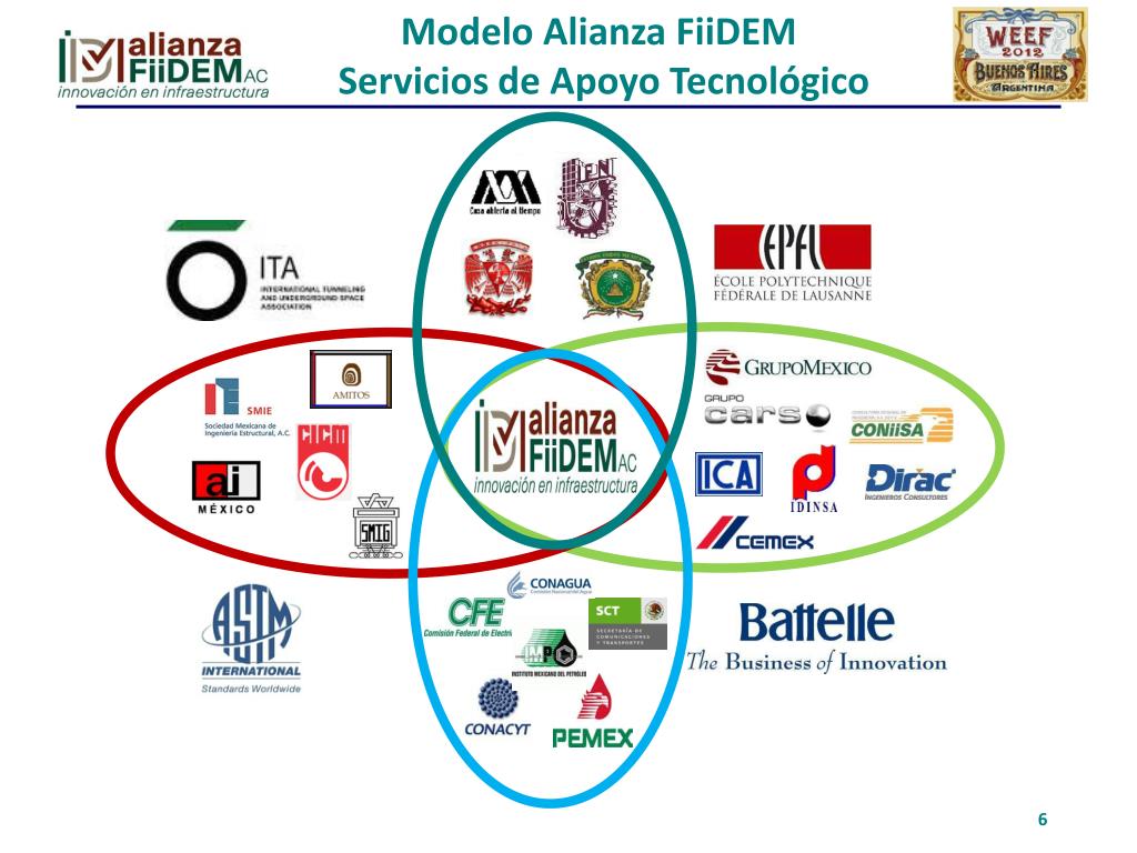 Objetivos de la Alianza FiiDEM • Articular, vincular y facilitar la colaboración de Gobierno-Empresas-IES-Asociaciones Profesionales, mediante las siguientes líneas estratégicas: • Formación y actualización de especialistas. • Investigación, desarrollo tecnológico e innovación. • Inteligencia tecnológica y gestión del conocimiento. • Sistema de calidad de la ingeniería. • Difusión y divulgación de temas de ingeniería e infraestructura. • Centros de Formación e Innovación (CEFI). Administración de Laboratorios .