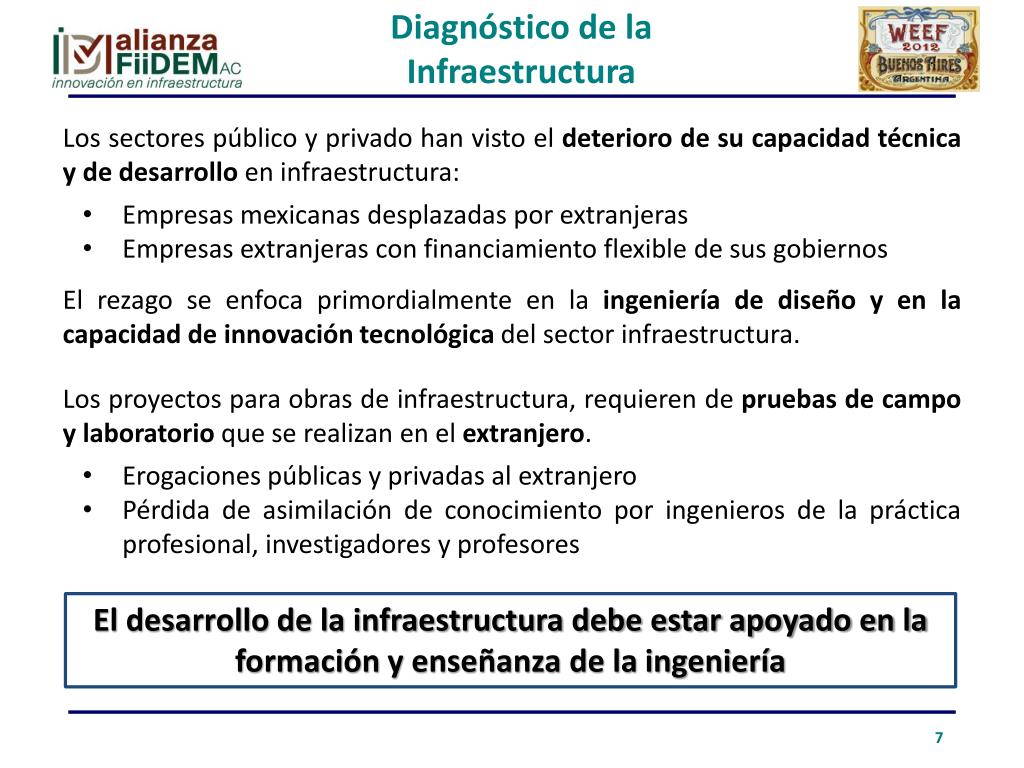 Diagnóstico de la Infraestructura • Los sectores público y privado han visto el deterioro de su capacidad técnica y de desarrollo en infraestructura: • Empresas mexicanas desplazadas por extranjeras • Empresas extranjeras con financiamiento flexible de sus gobiernos • El rezago se enfoca primordialmente en la ingeniería de diseño y en la capacidad de innovación tecnológica del sector infraestructura. • Los proyectos para obras de infraestructura, requieren de pruebas de campo y laboratorio que se realizan en el extranjero. • Erogaciones públicas y privadas al extranjero • Pérdida de asimilación de conocimiento por ingenieros de la práctica profesional, investigadores y profesores El desarrollo de la infraestructura debe estar apoyado en la formación y enseñanza de la ingeniería