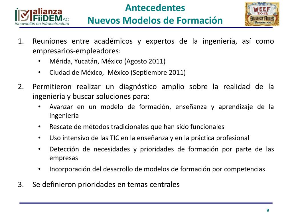 Antecedentes Nuevos Modelos de Formación • Reuniones entre académicos y expertos de la ingeniería, así como empresarios-empleadores: • Mérida, Yucatán, México (Agosto 2011) • Ciudad de México, México (Septiembre 2011) • Permitieron realizar un diagnóstico amplio sobre la realidad de la ingeniería y buscar soluciones para: • Avanzar en un modelo de formación, enseñanza y aprendizaje de la ingeniería • Rescate de métodos tradicionales que han sido funcionales • Uso intensivo de las TIC en la enseñanza y en la práctica profesional • Detección de necesidades y prioridades de formación por parte de las empresas • Incorporación del desarrollo de modelos de formación por competencias • Se definieron prioridades en temas centrales