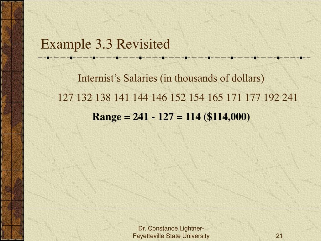 Example 3.3 Revisited Internist’s Salaries (in thousands of dollars) 127 132 138 141 144 146 152 154 165 171 177 192 241 Range = 241 - 127 = 114 ($114,000) Dr. Constance Lightner- Fayetteville State University
