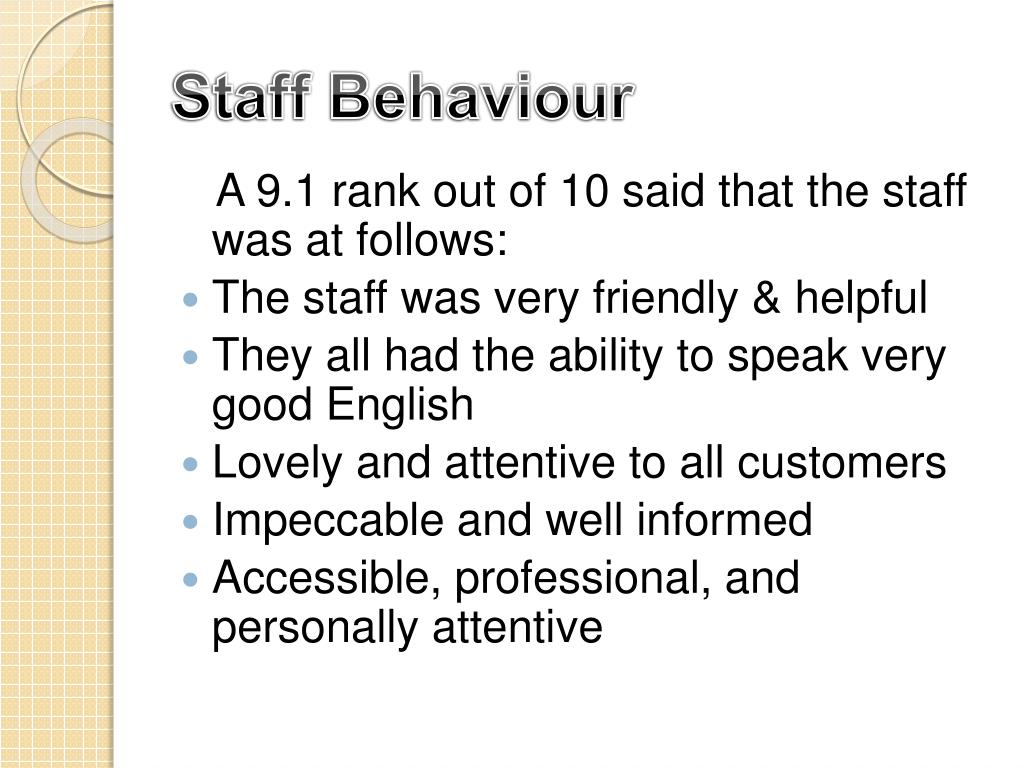 Staff Behaviour A 9.1 rank out of 10 said that the staff was at follows: • The staff was very friendly & helpful • They all had the ability to speak very good English • Lovely and attentive to all customers • Impeccable and well informed • Accessible, professional, and personally attentive