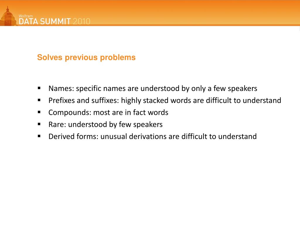 Solves previous problems • Names: specific names are understood by only a few speakers • Prefixes and suffixes: highly stacked words are difficult to understand • Compounds: most are in fact words • Rare: understood by few speakers • Derived forms: unusual derivations are difficult to understand