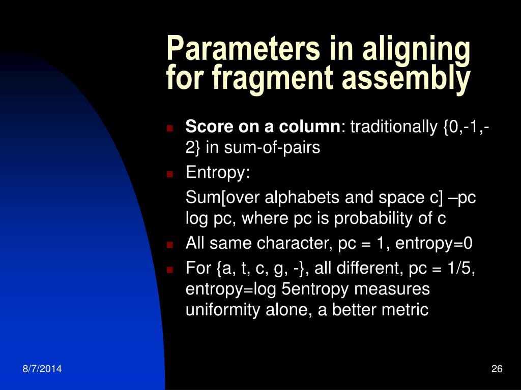 Parameters in aligning for fragment assembly • Scoreon a column: traditionally {0,-1,-2} in sum-of-pairs • Entropy: Sum[over alphabets and space c] –pc log pc, where pc is probability of c • All same character, pc = 1, entropy=0 • For {a, t, c, g, -}, all different, pc = 1/5, entropy=log 5entropy measures uniformity alone, a better metric