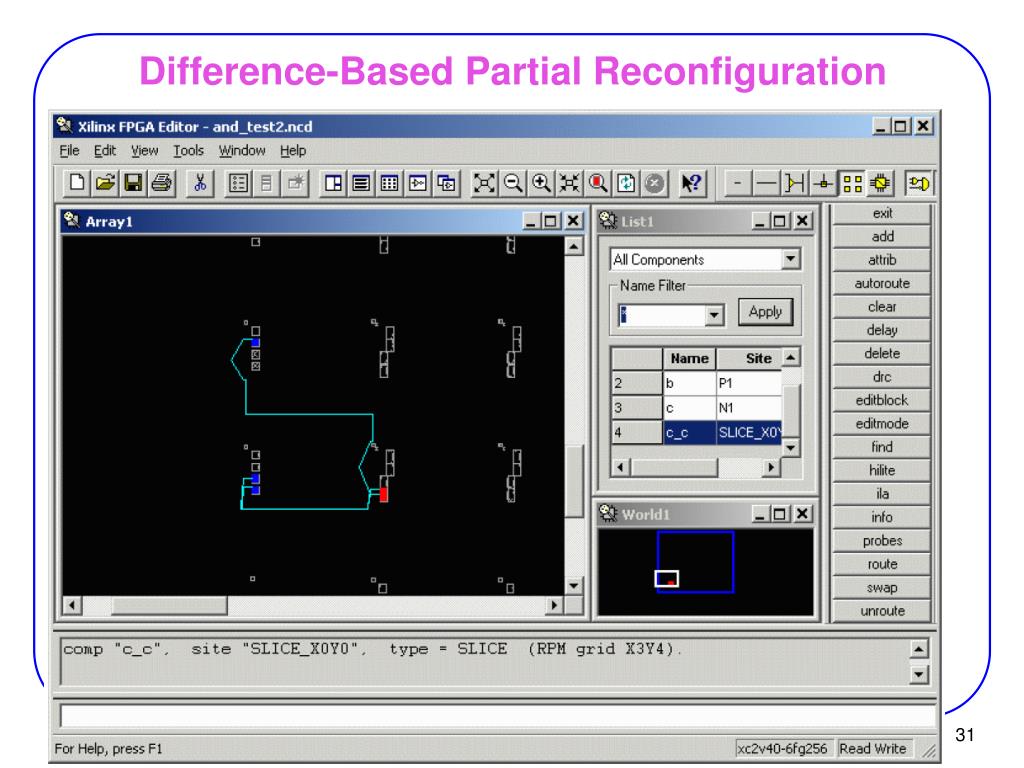 Difference-Based Partial Reconfiguration • Useful for making small on-the-fly changes to design parameters such as logic equations, …. • Procedure: • Designer makes small logic changes using FPGA_Editor: • changing I/Os, • block RAM contents • LUT programming • muxs • flip-flop initialization and reset values • pull-ups or pull-downs on external pins • block RAM write modes • Changing any property or value that would impact routing is not recommended due to the risk of internal contention • Uses BitGen to generate a bitstream that programs only the difference between the two versions. • Very quick switching