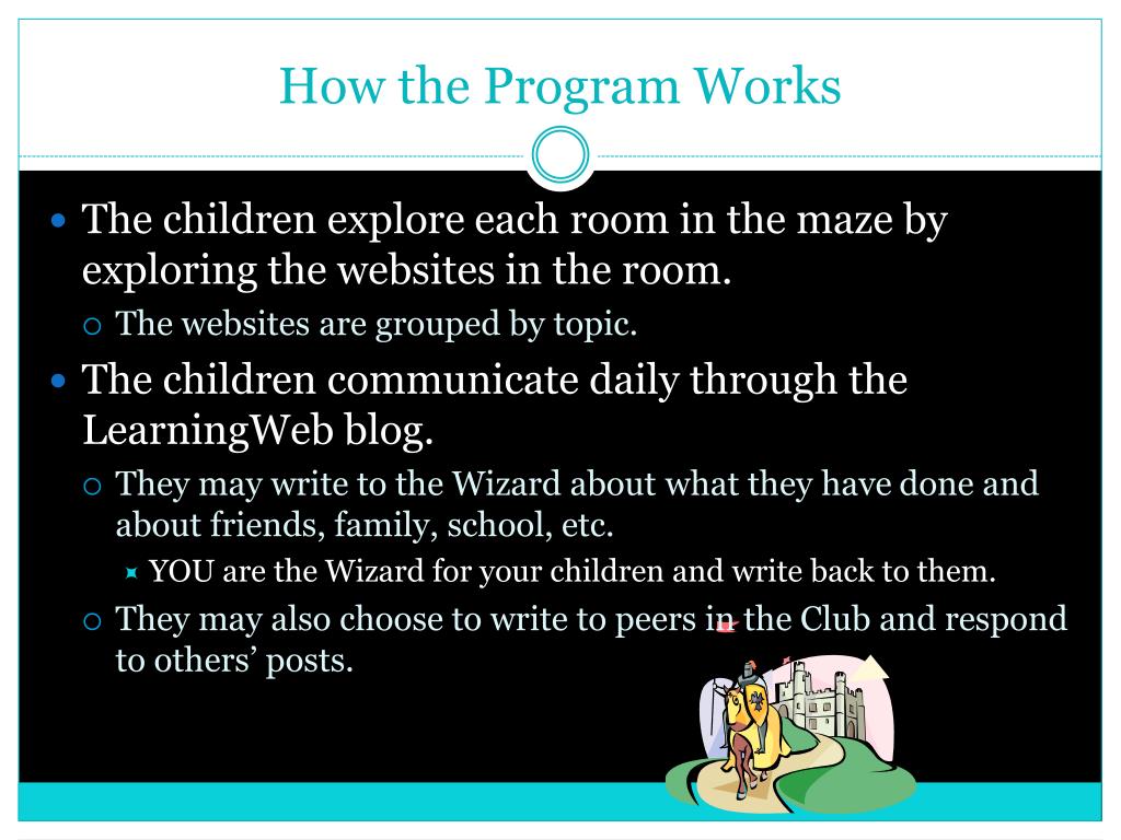 How the Program Works • The children explore each room in the maze by exploring the websites in the room. • The websites are grouped by topic. • The children communicate daily through the LearningWeb blog. • They may write to the Wizard about what they have done and about friends, family, school, etc. • YOU are the Wizard for your children and write back to them. • They may also choose to write to peers in the Club and respond to others’ posts.