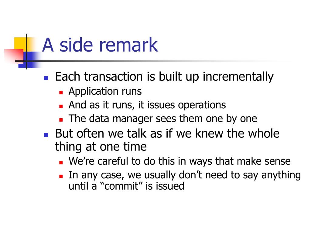 A side remark • Each transaction is built up incrementally • Application runs • And as it runs, it issues operations • The data manager sees them one by one • But often we talk as if we knew the whole thing at one time • We’re careful to do this in ways that make sense • In any case, we usually don’t need to say anything until a “commit” is issued