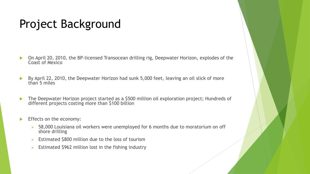 Project Background • On April 20, 2010, the BP-licensed Transocean drilling rig, Deepwater Horizon, explodes of the Coast of Mexico • By April 22, 2010, the Deepwater Horizon had sunk 5,000 feet, leaving an oil slick of more than 5 miles • The Deepwater Horizon project started as a $500 million oil exploration project; Hundreds of different projects costing more than $100 billion • Effects on the economy: • 58,000 Louisiana oil workers were unemployed for 6 months due to moratorium on off shore drilling • Estimated $800 million due to the loss of tourism • Estimated $962 million lost in the fishing industry